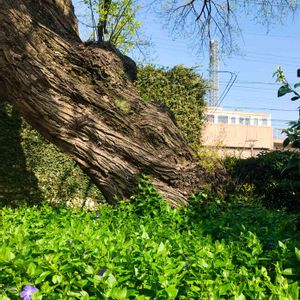 中央線の電車が木陰から見えます 幹がとても太くて神々しい✨ 不思議🌀な空間はこの木があるから? どなたか、この木の名前を教えて ください😊