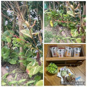 皆さんこんにちは。 斑入りの水引が綺麗に色付いてきました。 葉が、日焼けしてるなぁ。 花友さんのとこさんから、素敵便。 大きな寄せ植え用の鉢も。 何を植えるか楽しみだわ。 いつもありがとう。