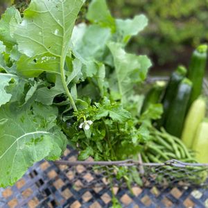 野菜部👩🌾 今日の収穫です。 かき菜 ルッコラ ズッキーニ スナップエンドウ マルインゲン(さっきみどり)