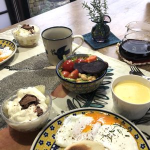 (美味しい部) 🎶ターキッシュエッグ withフラットブレッド♫ 水切りヨーグルトは塩、にんにく(すりおろし)をあわせてあり、パンに付けて食べるとദി ᷇ᵕ ᷆ ) 美味しかったです💓 𓌉◯𓇋その他のメニュー ・カボチャのポタージュ ・サラダ ・文旦とリンゴの豆乳ヨーグルトがけ ・コーヒー☕ 🌸ローズマリー