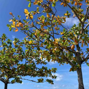 おはようございます☀ 久しぶりの晴れ〜気持ちいい〜🏝 モモタマナの木🌳 葉が台風の影響で傷んでいます。 さ!今日から復活だ✊😆