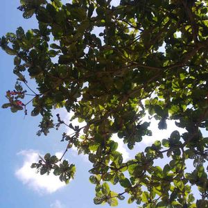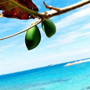 浜辺に生える背の低いモモタマナ。 小さな花と青い実を撮ることが出来ました。実は大きくなって自然に落ちたものを割って中のナッツを食べます。 様子を見て拾いに来なくちゃ。地元の人もビニール袋片手に拾いに来ます。😆