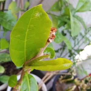 真新しい葉が出てます 何年か前、石垣島で買った種が大きくなりました。 モモタマナです🍀