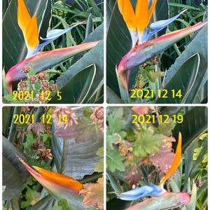 極楽鳥花 隣街の花壇 ↖️最初の一個目の花がさいた。 ↗️同じ苞の中から2個目の花が咲いた。 オレンジ色は萼 花は青色。 2個目の花は立っているようだ。 暖かい場所では3個も4個も花が 咲くので花期の長い花という。 ↙️もう1本短い花茎に出来た蕾 ↘️14日の蕾が今朝開花してた。 青色の花の先に雌蕊が見える 雄蕊は青色の丸まった花弁の内側 オレンジ色の萼が一個だけなのは マダガスカルや南アフリカ原産のストレ リチアには寒すぎるから?