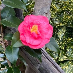 2022,1,11 8:11撮影 3日前植栽地で1番大輪の椿が咲き始めた。 18cm位の八重咲き。 桜の花が散り始める頃まで咲いてくれる。 30年以上ここで咲いている 品種名はわからない