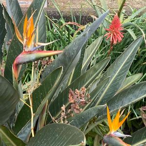 2022,1,24 8:12撮影 隣街の花壇 ストレリチアが気になって、何度も来てしまう。 今朝は低いストレリチアに2個の花が咲いてる‼️ 1月19日に来た時は12月22日の一つの花が萎れて乗っかってただけだったのに。 こんなに寒波の合間に咲いてくれるの 嬉しい❤️💛😊 後ろのキダチアロエの赤い花6本も元気に咲いてる❤️❤️❤️❤️❤️❤️