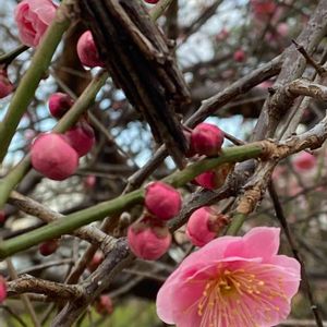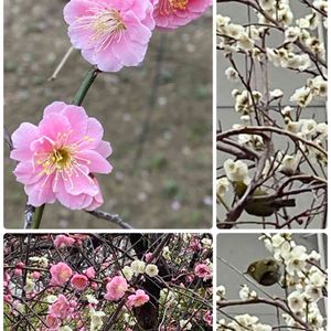 2022,3,1 8:45撮影 隣街の中庭 枝垂れ梅まだ4分咲き位。 2年前は2月11日で5分咲き位になってた。 今年は何度も寒波がくるので開花遅い💦 たくさんの小鳥さんが遊びに来てる もしかするとメジロ? 遠くからなのでわからないけど6枚位撮る。 八重白枝垂れ梅八重薄紅枝垂れ梅 花の形がとても可愛い💕