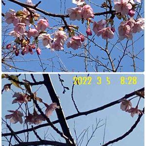 2022,3,5. 8:28撮影 昨日今日と少し春日和 隣街の早咲き桜少し開花😃 ⬆️陽光桜花径4〜5cm ⬇️河津桜花径3cm 去年は河津桜が早く開花 少し後陽光桜が開花 今年は陽光桜が河津桜より開花数が多い