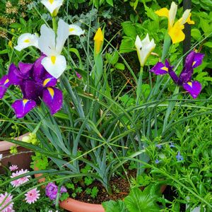 おはようございます。 アイリス右側も、咲きました。 10号鉢です。 プランター65のマーガレットダークあずきも、たくさん咲いています。 シュウメイギクの葉も、青々としてきました。