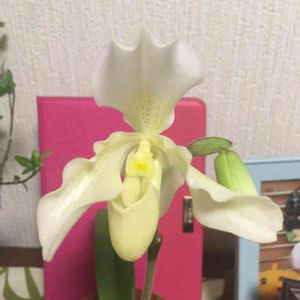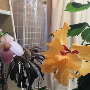 去年4/6にpicしたパフィオペディラム 開花しました🙌 まだまだ蘭は⁇ですが、面白いです(^^) 季節外れのハイビスカス🌺も‼️