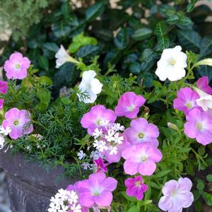 ❁ 寄せ植え❁ ☆朝霧草 ☆タピアン ☆湘南ヴェルデ ★横の寄せ植えから侵入の ペチュニア オペラガール 本日連投になります(❁ᴗ͈ˬᴗ͈)⁾⁾⁾ 違う所への侵入も流れで可愛い💗✨