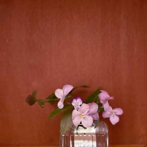 花を飾る✾𓈒𓂂𓇬. 小さな空間に花みどり やっぱり〜 もぅ 終わりですよね~ viola 最後にカット✂️ 小さな 小さな瓶🫙へ ( 捨てるつもりだった アロマオイルの瓶 ) ビオラの後は 何を🙄?? 悩み中 花が沢山あるこの時期は またそれで 悩むー一 ꉂꉂ(oˆ罒ˆo)