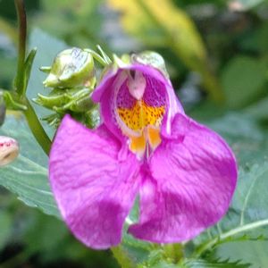 ツリフネソウ(釣舟草)(吊舟草) ツリフネソウ科 同属 別名 ムラサキツリフネ 北海道から九州のやや湿った場所に生える 山を下った小川の斜面にに綺麗なピンクの小舟の様なお花が咲いていました🚤💕 吊り下げられている様子も可愛いです💕 花序は葉腋から斜上し、紅紫色の花を数個つける 花序の茎には紅紫色の突起毛がある 花は3〜4cmで花弁は5個あるが、外側の2個は合着するので、3個に見える 花弁は下の2個が大きくて、中程に黄色の模様と、紫色の斑点がある 萼片は3個からなる 萼片も赤紫色で、花の様に見え、 下の一個は大きく袋状、その先端は細長い距になって渦巻き状で蜜をためる 全てお花かと思ったら前面がお花、細長い後ろが萼でした 雄性期から雌性期に移行する花…雄蕊は5本、雌蕊の花糸は短く葯が合着して包み込む) ツリフネソウ科同属のインパチェンスも同じ花の作りだそうです