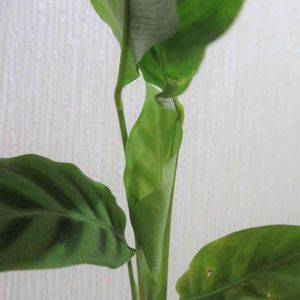 カラテア ゼブリナ 2021/9/26撮影 新芽を写そうとしたら、もう葉っぱが寝ちゃっててピーンと立っていました。 まるで頭上で手を合わせてお願いしているみたいです。 我が家の環境になじんでくれるといいんだけどな。