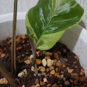 カラテア ホワイトフュージョン 2021/10/7 撮影 株分けしたら、葉っぱ落ちて新しいのが出てきました。 白い部分が少ないですが、ホワイトフュージョンです。 新芽シガールの手前に、もうひとつ新芽が出てきました。