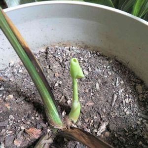 モンステラ 斑入り 2021/5/22撮影 新芽ドリルが出てくるはずの「うなじ」が枯れてしまってて、横からチョコンと新芽が出てきました。 どんな葉っぱになるのか…とても気になります。