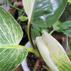 フィロデンドロン バーキン 2020/11/9撮影 手前に写る新芽が開きました(((o(*゚▽゚*)o))) こんなにも白い葉が出るなんて! ちなみに奥に写るハーフムーンの葉、茎の色も面白いと思いませんか。