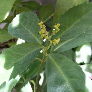 こんにちは〜😊 ベランダにて 千両に緑色の実が付き始めました。 実がなるのは初めてなので、楽しみです🥰