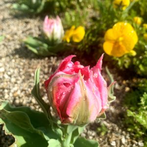🌷暑がり家のチューリップリレー🌷 こちらはこれからが本番。 変わりゆく花色が楽しみです💛 ティンカさんの鉢に、次は アントワネットさん。