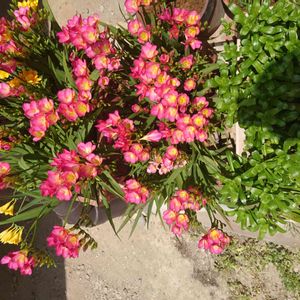 おはようございます🌅 今日は、ピンク、赤、黄色いフリージアの花が綺麗にたくさん咲いています。 ピンク、赤、黄色いフリージアの花が綺麗です。