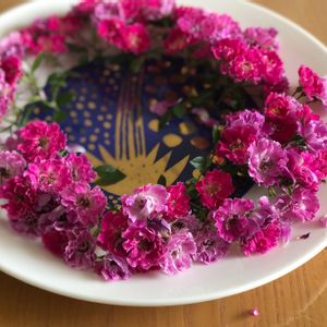 💖🩷🤍つるミニバラ 須磨 💐ミニアレンジに 花茎が短いのでパーティー皿に並べるだけ。 これで25房、約100輪。 倍量で出来上がり♪ 🏷️水曜ローズショー