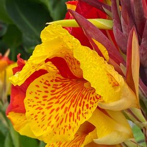 カンナらしいです💦 名前を忘れてしまい教えて頂きました💦 葉の色が気に入って購入したお花です! とても迫力のあるお花が咲いています!鉢植えですが大きくなる予感😍