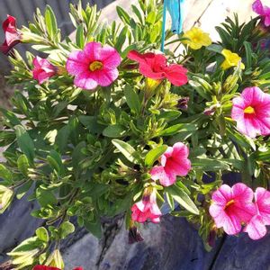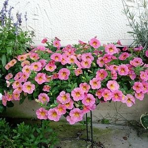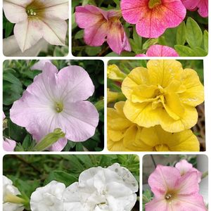 我が家のペチュニア たち 左上シルキーピンク 左中ラベンダーピンク 右下ひなペチュ 他はカリプラコアセレブレーション それぞれ個性豊かです
