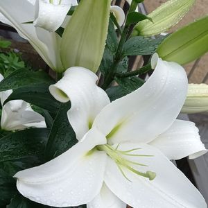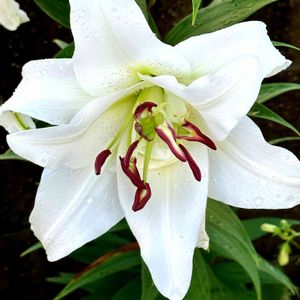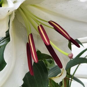 カサブランカが今年も咲きました。雨☔の中、昨日一輪、今朝二輪、静かに咲いていました。例年より花数が少ないけれど、大輪で真っ白な美しい姿です。 うっとり…💕✨ 今年は香りがなぜだか殆どありません。いつもは香りが強すぎるので、私には好都合なんですけどね…。🥰 私のこだわりは真っ白な花。 それぞれ好みがあるので、雄しべの赤を残してコントラストを楽しむ方もありますよね。🌿✨楽しみ方は自由です。🐰🌿✨