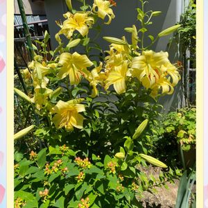 庭の一角で 黄色いカサブランカ💚💛💚 豪華に咲いています💖(*´∇`*)