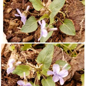 ⑨ コスミレ(小菫) フォロワーさんからコスミレと教えて頂きました。 葉は長さ2~6cmの長方角形~長卵形で鋸葉がスミレより明瞭。 花弁は幅が狭く長さ1~1.5cmで淡紫色、紫色のスジが見える。 地上茎が無い無茎種。
