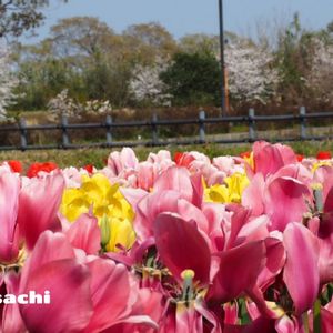 こんにちは🍀 休憩終わりに一枚投稿します… おとといの通院の帰り道… 少し脇道へ入ると、こんな夢のような光景が… もりもりのチューリップ畑と桜の競演🌸🌸🌸