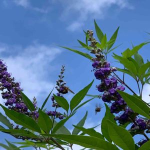 こんにちは😊 公園の帰り道、知り合いの玄関先の西洋ニンジンボクの返り咲きが綺麗でした💜 色が濃くなっているのは秋だからでしょうか❓ 青い空と白い雲、紫のお花💜が何とも言えず綺麗でしばらく見とれていました😊💕