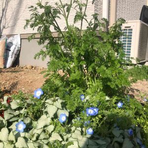 オルラヤ開花しました。足元にはラミウムとネモフィラ。葉っぱが人参に似てるね、とお友達に言われました。