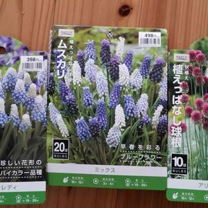 ムスカリとアリウム✨ 水色系のムスカリが欲しかったので、白から紫まで入っているタイプもget☺️ アリウムは初めて迎えてみました😊 秋の園芸センターやホムセンは誘惑多すぎ〰️💦 チューリップは我慢😓 だって去年の球根が沢山あるので💦持ってないチューリップ🌷も欲しかったけど💦もぅ植えるプランター無くなっちゃう😳