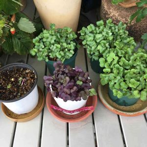 カイワレ大根栽培サイクルⅡ−5。 左鉢は昨夕収穫。他はそろそろ収穫時と成りました。