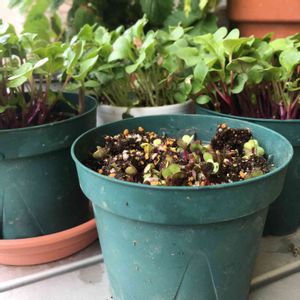 カイワレ大根栽培サイクル23。 右鉢ルビーカイワレの芽が出ています。中央手前はもう食べ頃です。