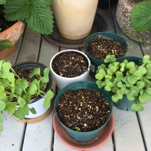 カイワレ大根栽培サイクル39。 左右鉢の種がもう立ち上がり始めました。手前鉢カイワレは少し収穫しました。