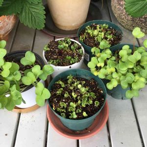 カイワレ大根栽培サイクル38 土を全部新しくしたので葉が大きくなりました。左右鉢の種がもう膨らんでいます。