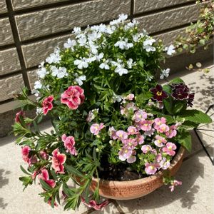 新作寄せ植え🌸 ずっとポットのまま待機させてたミリオンベルプチホイップと、 先週買い足したロベリア、ネメシアに 灰色かび病療養明けのプリムラジュリアン! ちょっとバランスが微妙になってしまいましたが… ジュリアン、今度こそ頑張ってくれ〜