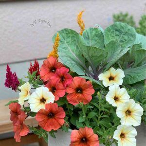 うちの茎が残っていた葉牡丹、 踊ってくれると思ったら、 全然 オトナしいまま😅 イメージは…ハロウィン🎃 ビューティカル *キャラメルイエローと 種まき鶏頭の黄色& 葉牡丹の紫色のスジスジで まんまる ハロウィン🎃風な寄せ植え❗️ を目指しましたが あはは🤣 なかなかビューティカルが 咲き揃わないわ💦 (不完全なままアップする私😱)