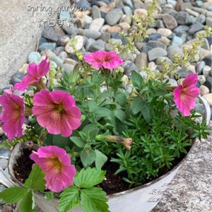 4月28日にアップした寄せ植えの裏っ側です〜💕 雪国の冬を 雪❄️を被りながら お外の軒下で冬越しした ビューティカル*ボルドーが また 咲いてきました。 あー! この前にカット✂️するのを忘れて 四方八方に伸びてる 自由人です〜😁