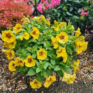 ペチュニア ビューティカル キャラメルイエロー 満開近くになりました。 株幅30cm,高さ20cm φ(..)2025.4.13 花苗植え付け