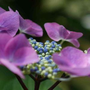 庭の紫陽花 色づき始めました。 赤紫色の額紫陽花。