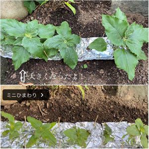 『ひまわりを守って花を咲かせるぞプロジェクト🌻』一つだけ枯れてしまいましたが、残りの4つは今のところ順調です! 大きくなったなー☺️✨