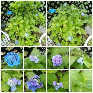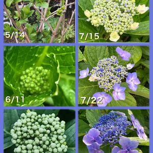 青い紫陽花前線2020 番外編?です。 葉っぱが芽吹いた5月から6回 開花の進み具合をまとめました。 みどりのまとめにするほどでもないので… コラージュで😅 自己満足picです😜