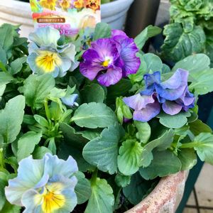 ビオラ💙💜 大好きなブルー系のお花たち うちはカラスに狙われるので、 バラの枝の下で、集います♡ ・フローラルパワープラムアンティーク💜 ・ビビクリアライトブルー💙 🏷美しく青きドヨウ