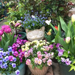 チューリップが咲き出しました🌷 パンビオの鉢から、チューリップが目を覚ましました。 ワスレナグサの帽子をかぶったネコバスも 嬉しそうです🐱💠 バラの葉っぱもふさふさです🌿