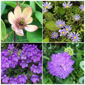 私たちも咲いています🤗 バナナの香りのするカラタネオガタマ ブルーリボンのブルーデージー 紫が鮮やかなベルフラワー(オトメギキョウ) ピンクのバルーン スカビオサ
