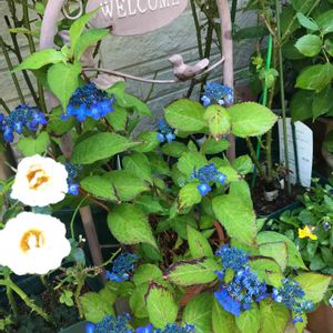 ヤマアジサイ 藍姫 この藍姫さんは去年お迎えしました。 本来の藍色です💙 ミニバラさんとなかよく咲いてます💠