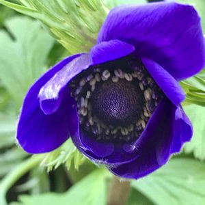 アネモネ✩.*˚ 緑の葉っぱの海をかき分けて、 やっとそのお姿見せてくれました💜 たくさん植えた球根の一番さんです♪ 深い紫に吸い込まれそうです𖦹⍛𖦹